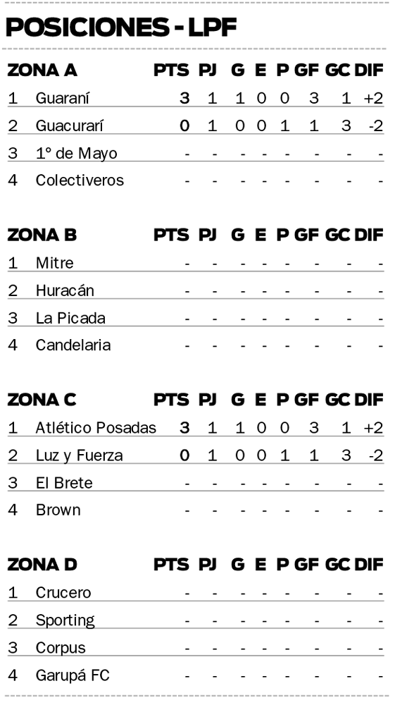 La primera fecha del certamen concluirá el fin de semana venidero con otros dos partidos. Según el cronograma oficial, el sábado desde las 16 chocarán en el estadio de El Brete el dueño de casa ante Jorge Gibson Brown; mientras que al día siguiente, nuevamente en ese reducto de San Isidro, Garupá FC actuará como local para recibir a Deportivo Corpus.