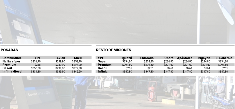 Es así que desde Apóstoles hasta Puerto Iguazú, pasando por Oberá, El Soberbio, Eldorado y Bernardo de Irigoyen los valores en YPF quedaron de la siguiente manera: súper, $234,80; Infinia, $291,60; el gasoil Ultra, $261 y el Infinia diésel, $347,80.
