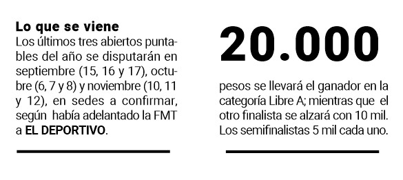 La competencia se desarrollará en las categorías Libre A, B, C y D, para Mayores 30 A y hasta +60, además de la categorías Damas A, B y C.