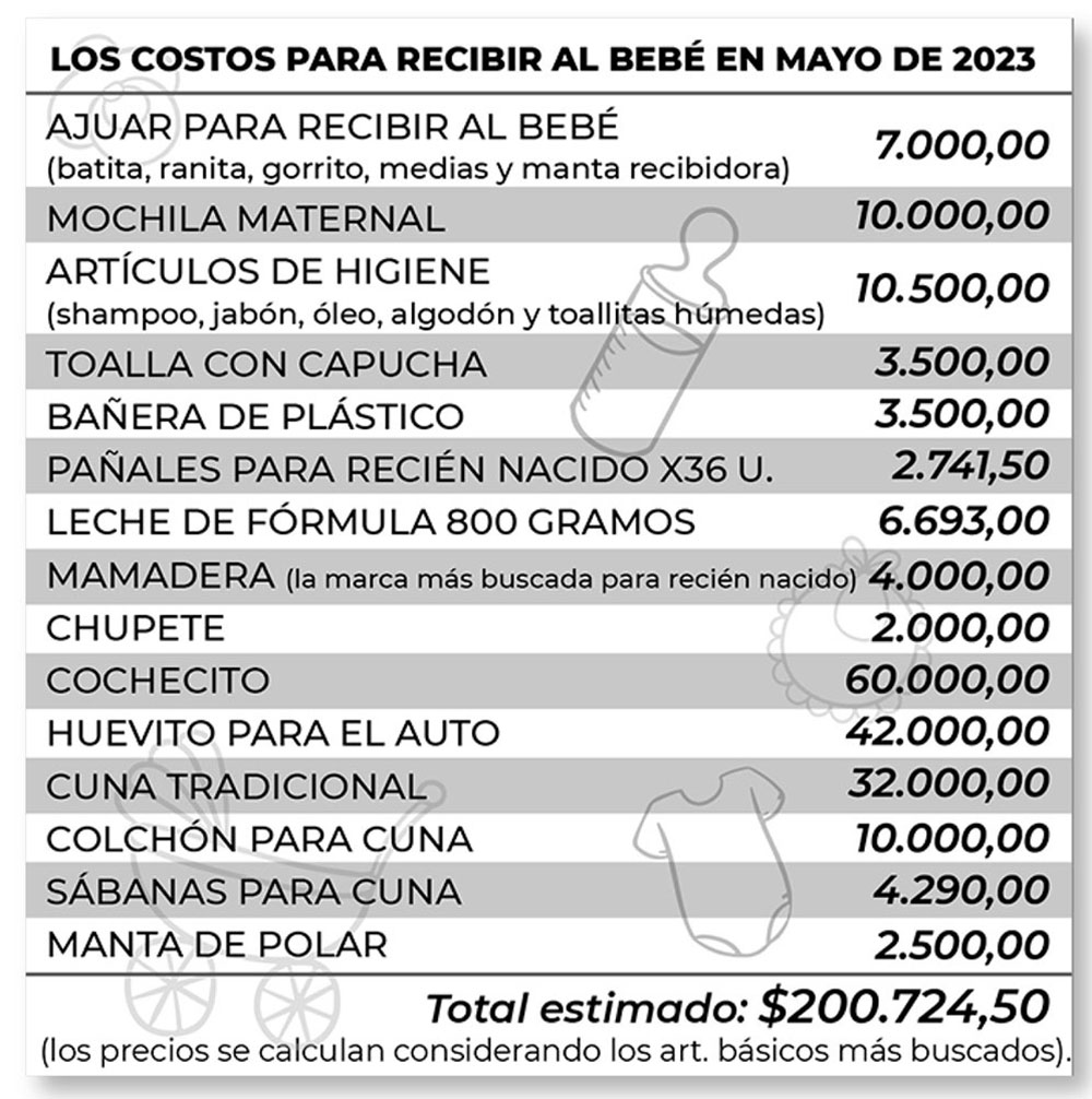 Lo primero a tener en cuenta es el ajuar de recién nacido, la muda de ropa que va a utilizar el bebé para salir del hospital, que se lleva en la mochila maternal (de entre $10.000 y $40.000), la cual consiste en un body ($1.990), gorro ($450), babero ($500), bata ($1.590), ranita ($1.000), un par de medias ($450) y una manta recibidora que ronda entre los $2.000 y los $3.900.