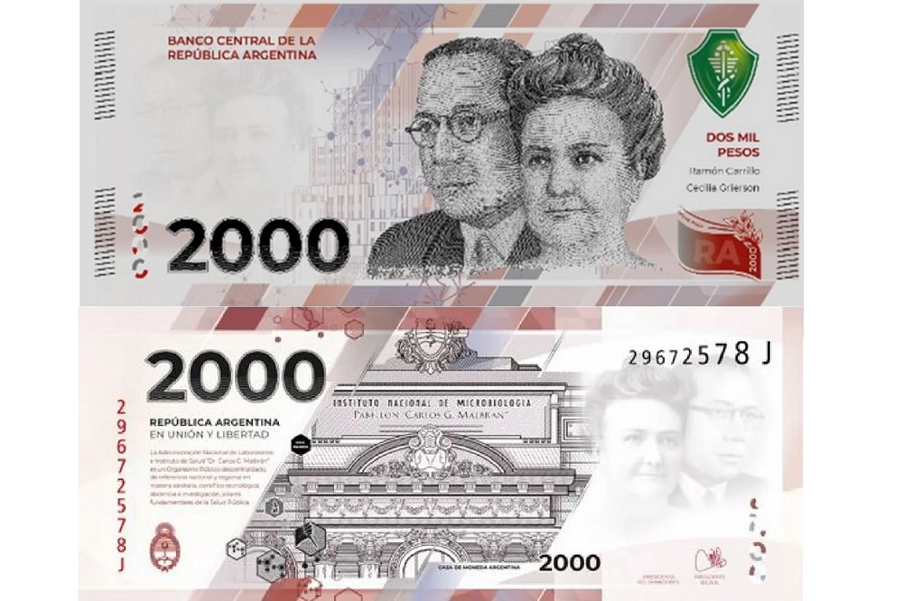El nuevo billete conmemora el desarrollo de la ciencia y de la medicina en la Argentina y presenta como protagonistas al Instituto Nacional de Microbiología Dr. Carlos Malbrán, en el reverso, y a los doctores Cecilia Grierson y Ramón Carrillo, precursores en el desarrollo de la medicina en nuestro país, en el anverso.
