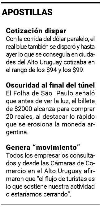 “De $85 que se pagaba la semana pasada pegó un salto hasta los $96 en los comercios, es un montón para la tasa cambiaria pero, con cómo están subiendo los precios en Argentina y mientras siga creciendo fuerte el dólar blue, para los hermanos del vecino del país va a seguir siendo ventajoso porque cambiar su dinero les permite una diferencia importante”, agregó.
