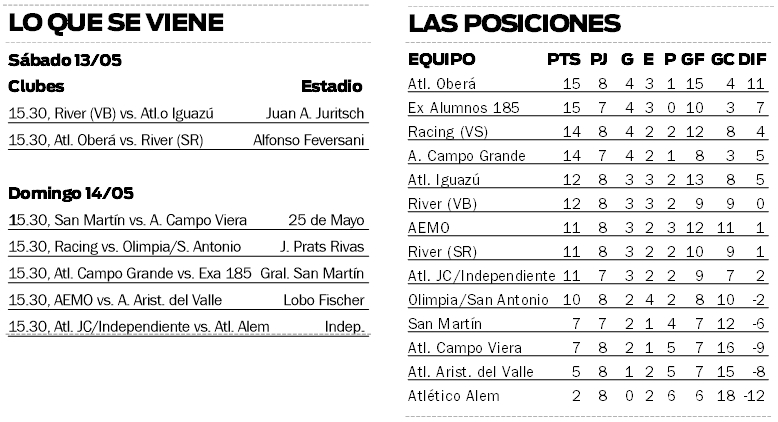 El sábado 27, Ex Alumnos 185 y Atlético Oberá jugarán el clásico obereño, desde las 15.30. En el mismo horario los harán los River de Santa Rita y Villa Bonita.