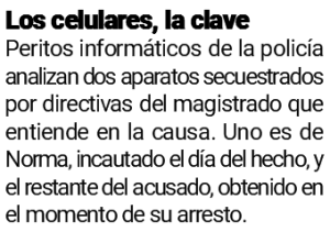 También en las últimas horas se conoció que el teléfono celular de la mujer y el del sospechoso, serán peritados por efectivos de la Dirección Cibercrimen de la Policía, cuando ese detalle era otra preocupación de la familia, ya que pensaban que el aparato estaba en poder del sospechoso en ese tiempo que no estuvo detenido y podría descartarlo para borrar algún tipo de evidencia o detalle que permita saber qué pasó previamente al ataque.