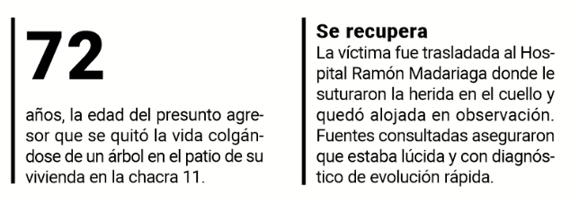Cuando llegó la primera patrulla policial fue asistida la víctima hasta la llegada de una ambulancia de la Red de Traslado del Hospital Ramón Madariaga. Fue llevada rápidamente al sector de Emergencias y se le suturó rápidamente la herida y pese a que perdió mucha sangre, se comunicó que se encontraba lúcida y el pronóstico adelantaba una evolución rápida.