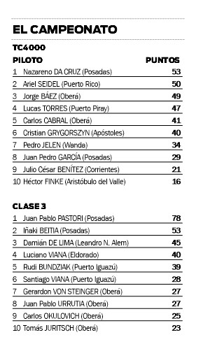 En cuanto a la Clase 3, la divisional más tecnológica de la tierra colorada, Juampy Pastori (78) ratificó el primer lugar en el campeonato luego del triunfo en la Capital del Monte y ahora manda con 25 puntos de ventaja sobre Iñaki Beitia (53), su más inmediato perseguidor.