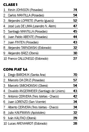 Sobre la Clase 1, la que cuenta con el mayor parque, Kevin Johson se mantiene al tope del clasificador, mientras que Diego Barchuk es el actual líder en la Copa Fiat 1.4, los tradicionales “fititos”; mientras que Mariano Tajada manda en el TCM. ¿La próxima fecha? Del 2 al 4 de junio en el Rosamonte de Posadas.