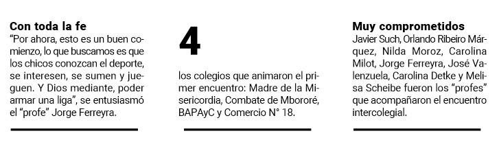 En esta, que fue la primera experiencia con alumnos de escuelas secundarias, participaron los equipos del colegio Madre de la Misericordia, del Instituto Combate de Mbororé, el Bachillerato Acelerado para Adultos y Común (BAPAyC) y el anfitrión, Comercio N° 18.