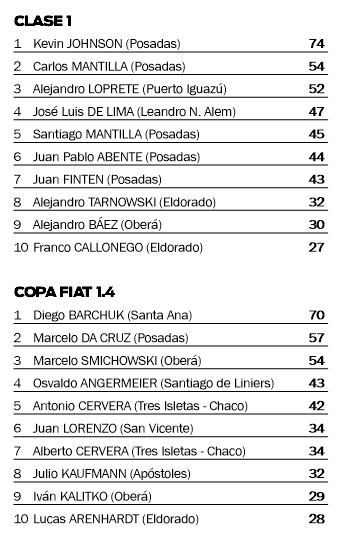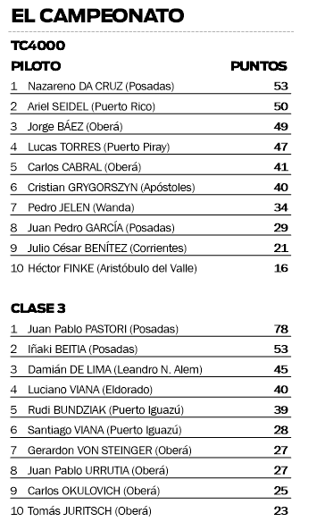 En cuanto a los campeonatos, el TC4000 tiene como actual líder a Nazareno Da Cruz, mientras que en la Clase 3 mira a todos desde arriba el posadeño Juan Pablo Pastori, que viene de obtener un buen rendimiento el último finde en la Clase 2 del TN, en Comodoro Rivadavia. Kevin Johnson (Clase 1), Diego Barchuk (Copa Fiat 1.4) y Mariano Tajada (TCM) también llegarán a Oberá en lo más alto.