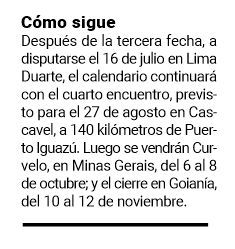 “Estoy muy feliz de poder ganar a nivel sudamericano. Sin dudas, es un fin de semana que será inolvidable para mí. Es la primera vez, así que estoy súper feliz y con muchas ganas de aprovechar y seguir con este envión”, sintetizó el representante de la tierra colorada, ya con la mirada puesta en lo que será la tercera fecha de la temporada, a correrse entre el 14 y 16 de julio en el autódromo Potenza de la ciudad de Lima Duarte, en el estado brasileño de Minas Gerais.