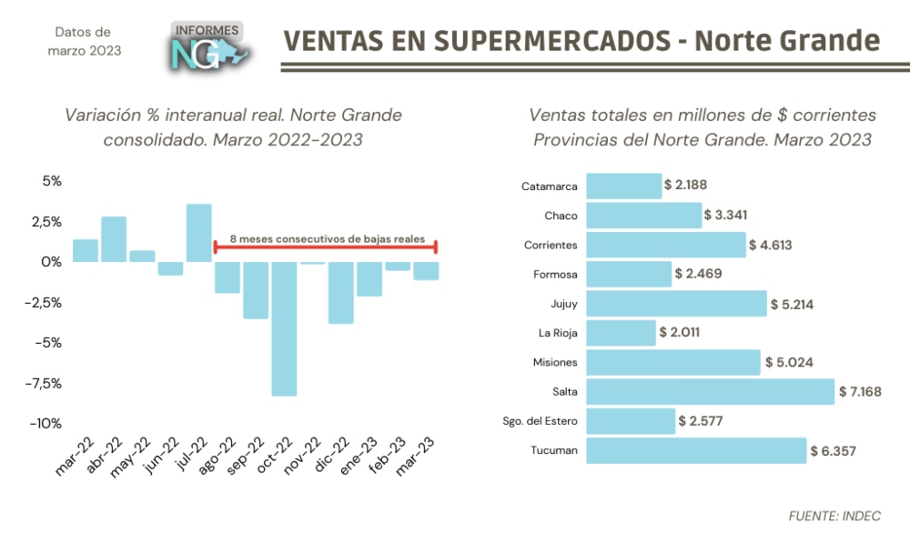 Según la Encuesta de Supermercados elaborada por el Instituto Nacional de Estadística y Censos (INDEC), a nivel nacional las ventas crecieron 3,8% pero tuvieron una caída de 1,1% en el Norte Grande consolidado. Para la consultora Politikon, encargada de recopilar los datos, “el consumo está en grave estado de alerta en la macrorregión al tratarse del octavo mes consecutivo con caídas”.