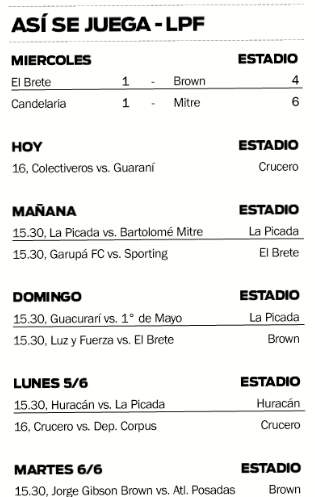En tanto, el martes próximo, la fecha se cerrará con el clásico más antiguo del fútbol posadeño entre Jorge Gibson Brown y Atlético Posadas, en cancha del primero, desde las 15.30.