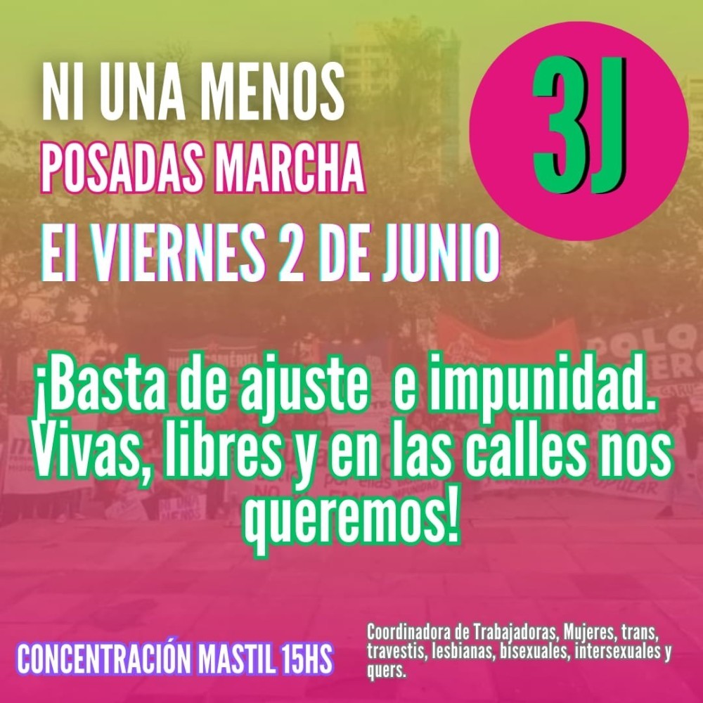 Desde Mumalá (Mujeres de la Matria Latinoamericana) invitan a sumarse a la marcha que organiza la multisectorial de todas las organizaciones que la componen hoy en Misiones. La concentración se llevará a cabo alrededor de las 15 en el Mástil de la ciudad (avenidas Mitre y Uruguay) para caminar hasta la plaza 9 de Julio donde se realizará el acto central.