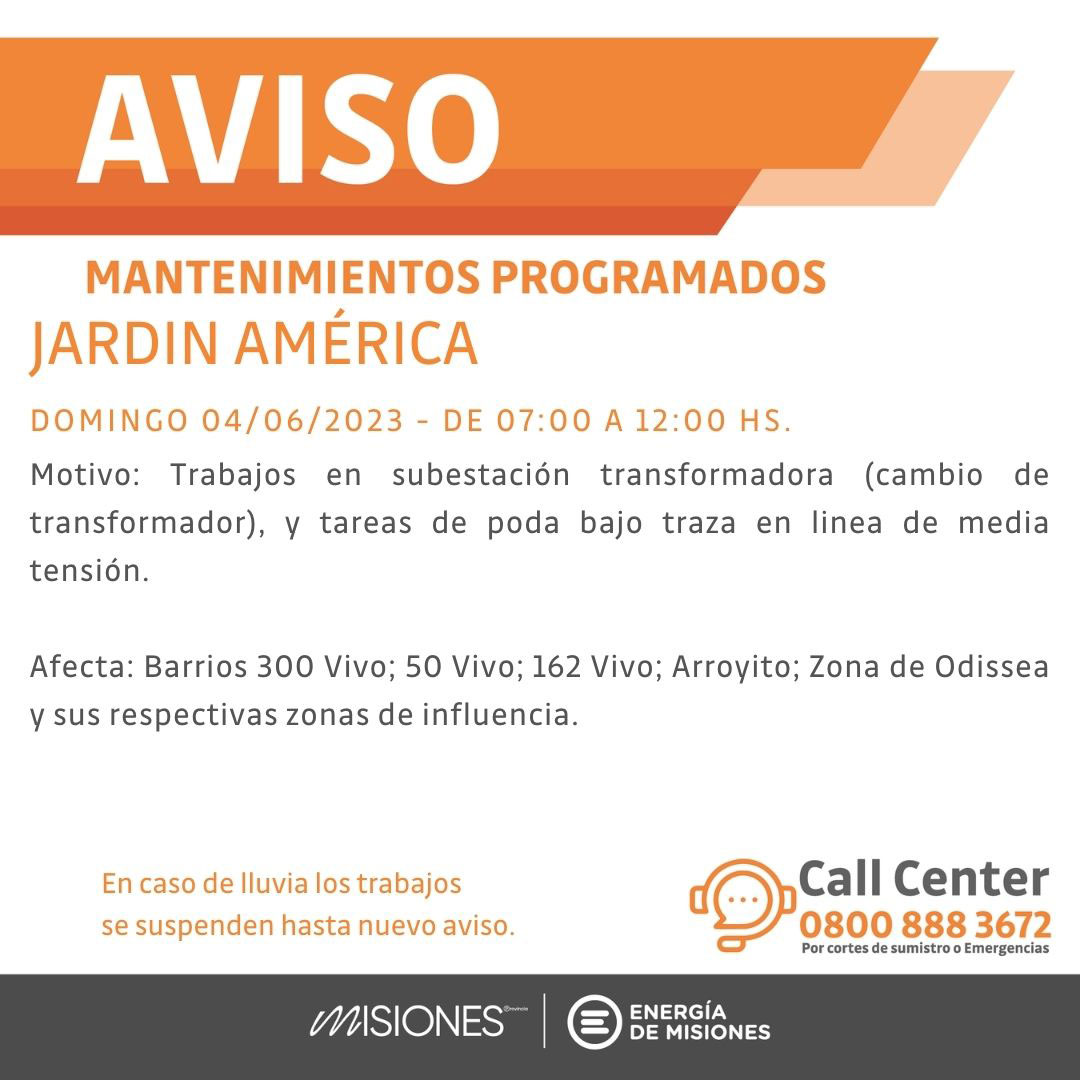 Por último, en Jardín América los cortes de energía serán este domingo de 7 a 12 horas por cambio de transformador y poda bajo traza en línea de media tensión. Barrios 300 Vivo; 50 Vivo; 162 Vivo; Arroyito; Zona de Odissea y los demás lugares de influencia.