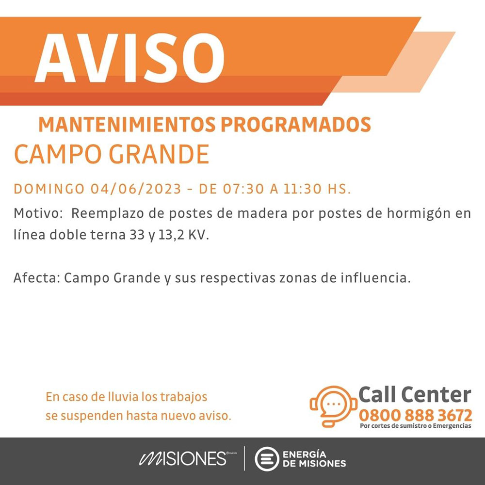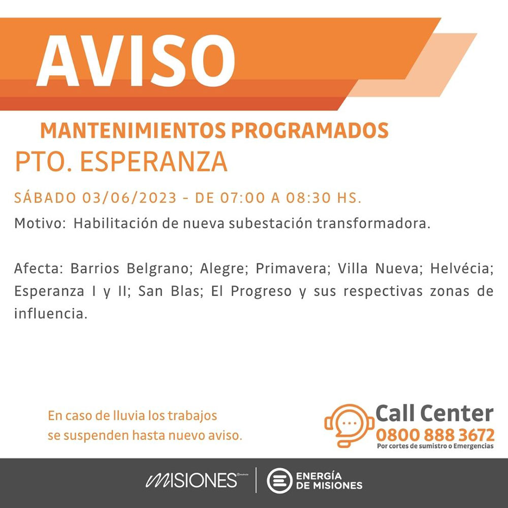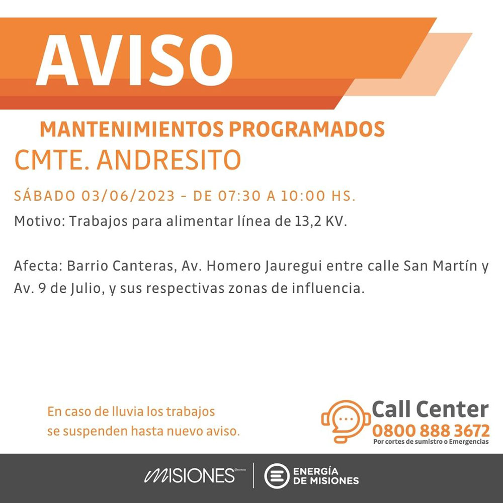 A su vez, en Comandante Andresito, también el sábado de 7.30 a 10 horas realizarán trabajos para alimentar la línea de 13,2 KV. Los barrios afectados serán Canteras, Av. Hornero Jauregui entre calle San Martín y av. 9 de Julio, además de los sectores cercanos.