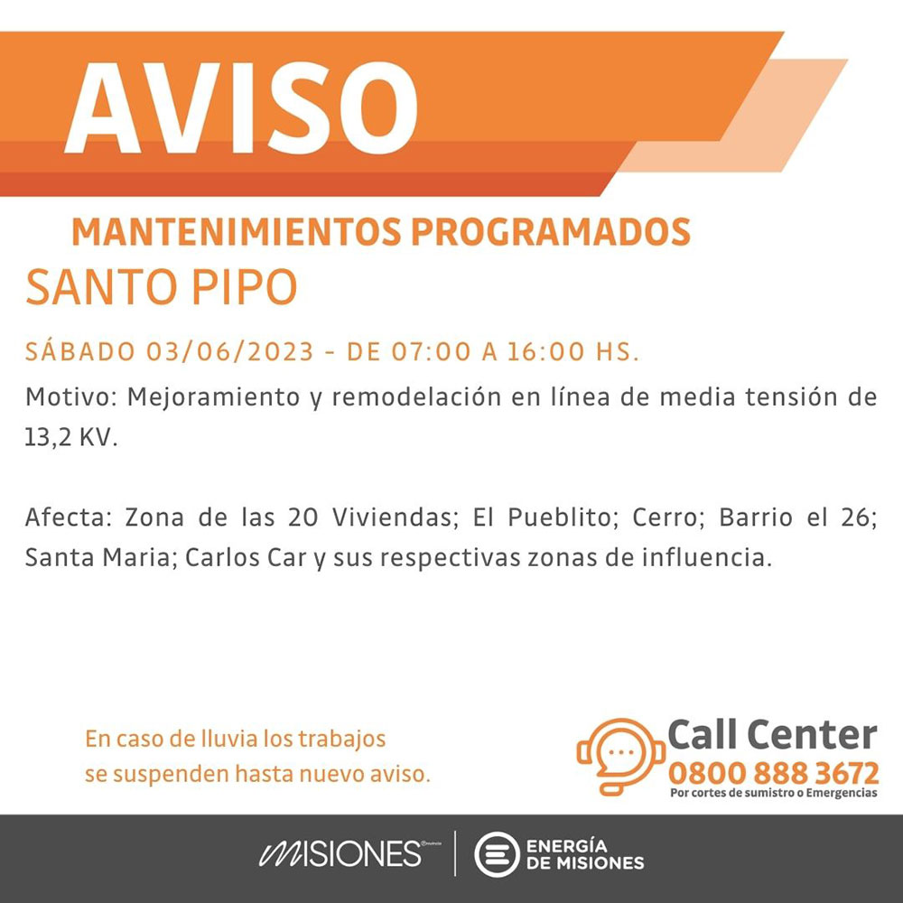 En Santo Pipó, por motivos de mejoramiento y remodelación, los cortes de energía se registrarán de 7 a 16 horas en zona de las 20 Viviendas, El Pueblito, Cerro, Barrio el 26, Santa María, Carlos Car y alrededores.