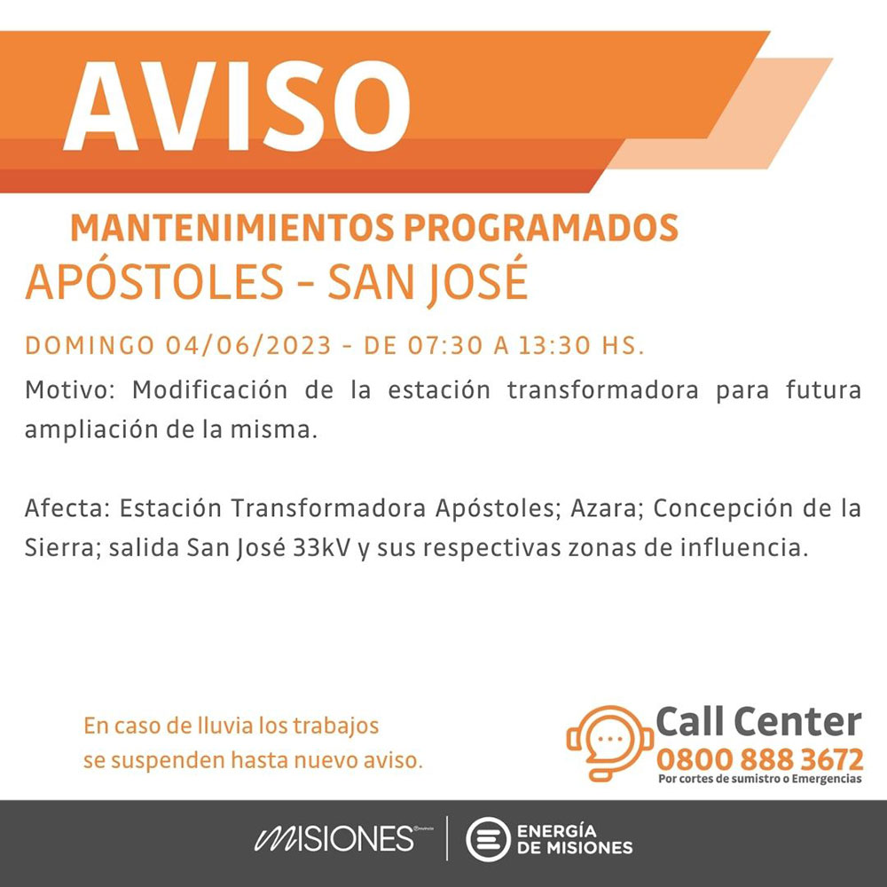 Por otro lado, en Apóstoles y San José modificarán la estación transformadora para su futura ampliación. Habrá corte de 7.30 a 13.30. Azara, Concepción de la Sierra y lugares aledaños también se verán afectados.