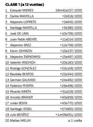 Respecto a la Clase 1, nuevamente fueron más de 30 los autos que formaron parte de la finalísima. En punta largó Kevin Johnson, pero el posadeño sufrió un despiste y el liderazgo quedó en manos del actual subcampeón, Ezequiel Mieres, quien debió aguantar los embates de los hermanos Mantilla – Carlos y Santiago- para ver primero la bandera a cuadros.