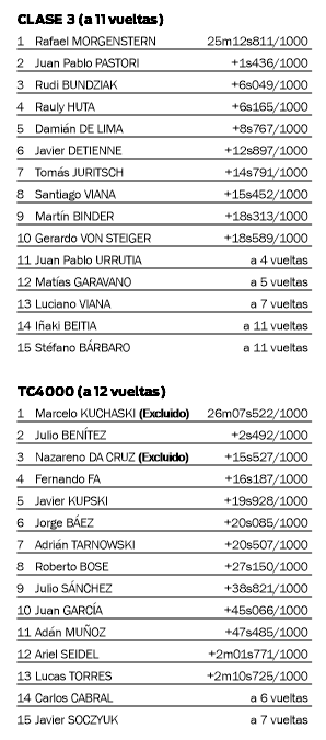 En la Clase 3, Rafa Morgenstern ratificó todo lo realizado en la jornada del sábado e hizo uso de su dilatada experiencia para aguantar los embates de Juan Pablo Urrutia, primero; y de Juan Pablo Pastori, después, para alzarse con la victoria. “Mosquita” terminó segundo y tercero fue Rudi Bundziak, en el marco de una categoría en la que brillaron los pilotos misioneros que actualmente tienen protagonismo a nivel nacional.