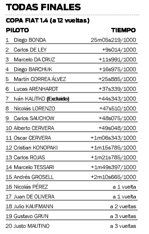 En lo que respecta a la Copa Fiat 1.4, los tradicionales “fititos”, la categoría también tuvo más de 30 autos. El protagonismo se lo llevaron rápidamente Marcelo Smichowski y Marcelo Da Cruz, pero desde más atrás comenzó a aparecer Diego Bonda, quien finalmente fue más que todos y se quedó con el triunfo en un apasionante mano a mano con Carlos De Ley.