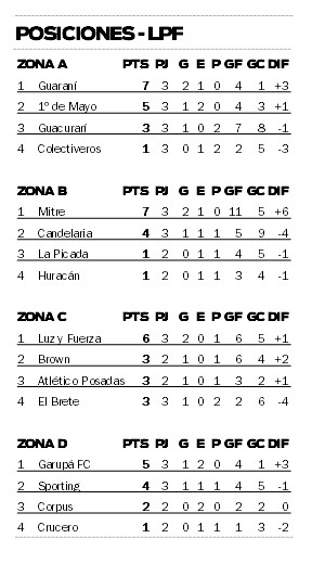 La grilla de la semana pasada estuvo cargada de encuentros, ya que había algunos adelantos y otros partidos pendientes. Los resultados fueron los siguientes: El Brete 1 – Brown 4, Candelaria 1 -Mitre 6, Colectiveros 0 – Guaraní 1, La Picada 1 – Mitre y Garupá FC 3- Sporting de Santo Pipó 0.