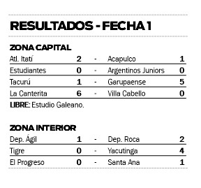 Por su parte, en la Zona Interior, Yacutinga superó por un amplio 4-0 a Tigre de Santo Pipó y Santa Ana derrotó por 1-0 al debutante El Progreso de San Ignacio.