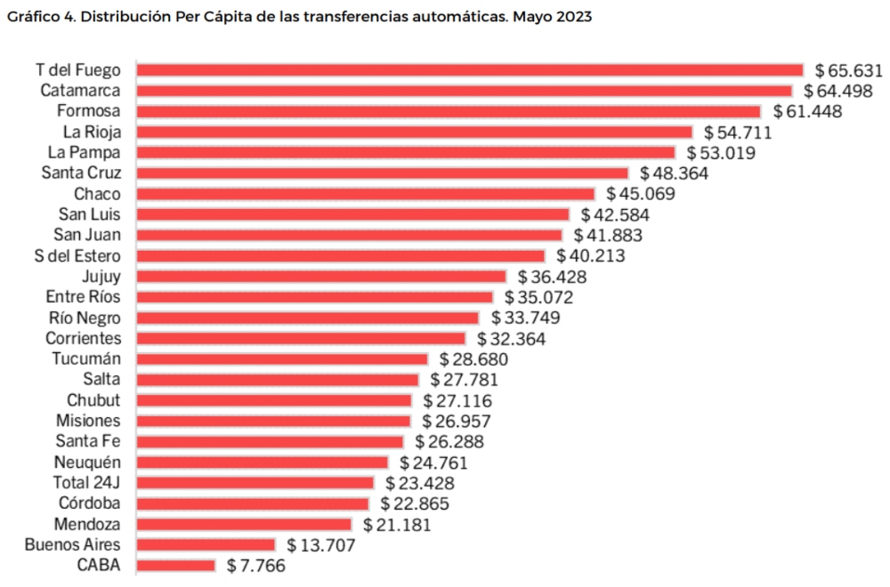 Algo más atrás quedan Tucumán, Salta, Chubut, Misiones, Santa Fe, Neuquén, Córdoba y Mendoza, que recibieron fondos equivalentes por habitante en un rango de $21.000 y $29.000; y finalmente la provincia de Buenos Aires y la ciudad autónoma de Buenos Aires captaron $13.707 y $7.766 respectivamente, los menores valores del país en este nivel.