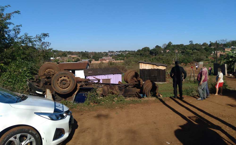 El siniestro ocurrió hoy, cerca de las 10:25 hs, sobre la calle Ocho del barrio San José. Se trata de un camión marca Ford 5000 que a raíz del despiste, terminó en posición invertida en el sector de banquina.