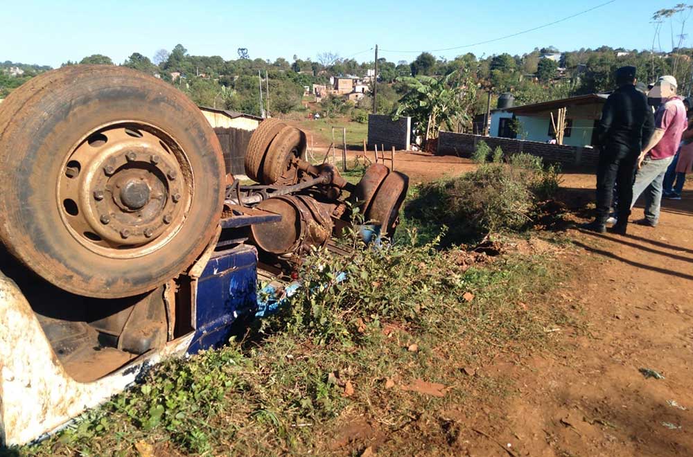 El siniestro ocurrió hoy, cerca de las 10:25 hs, sobre la calle Ocho del barrio San José. Se trata de un camión marca Ford 5000 que a raíz del despiste, terminó en posición invertida en el sector de banquina.