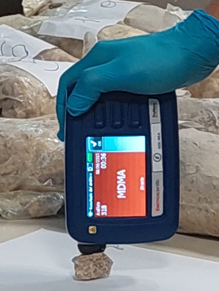 Asimismo, se solicitó el apoyo de personal del Grupo Operativo Coordinado del Noreste Argentino (GocNea) para realizar una prueba sobre el estupefaciente hallado mediante el uso de un Dispositivo Analizador de Narcóticos Portátil “TruNarc”. El dispositivo tiene como objeto la identificación rápida, certera y específica de sustancias sospechosas, arrojando resultado positivo para “MDMA-Metilenedioxianfetamina”, conocido comúnmente con el nombre de “éxtasis” o “molly”.
