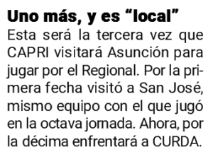 Vale recalcar que para CAPRI el partido ante CURDA es vital en la lucha por ingresar a los playoffs finales del certamen, razón por la cual buscará afrontarlo de la mejor manera.