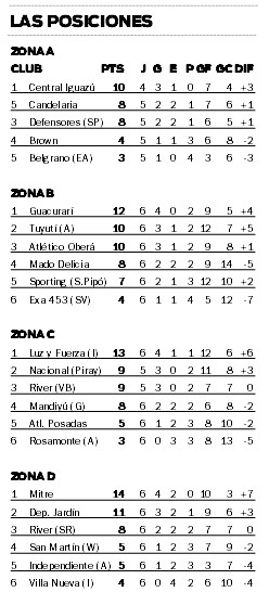Finalmente, en la Zona D, Bartolomé Mitre no pudo imponer su localía e igualó 0-0 con Independiente de Apóstoles, pero de todos modos se encuentra en la cima, con tres puntos de ventaja sobre Deportivo Jardín América, que igualó 2-2 con Villa Nueva de Iguazú. En tanto que River de Santa Rita superó por 2-1 a San Martín de Wanda.