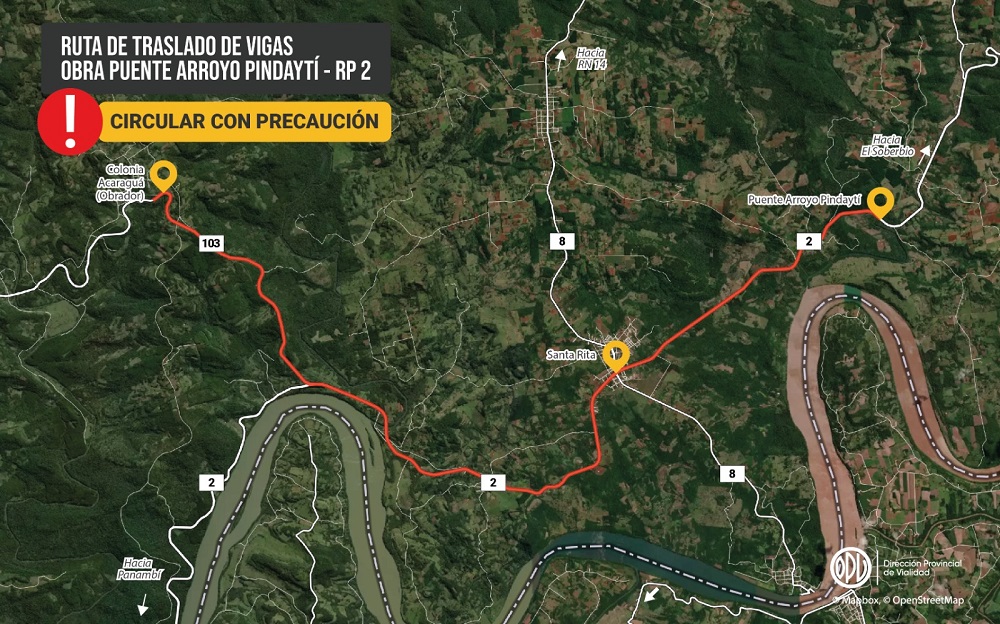 La Dirección Provincial de Vialidad (DPV) informó que a partir de este lunes 12 de junio se trasladan vigas postesadas que se utilizarán en la construcción del puente sobre el arroyo Pindaytí, en el municipio de Alba Posse, donde está emplazada la obra.