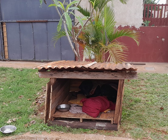 Así, todos la miman y La Negrita iba de casa en casa, durmiendo donde más le convenía en cada momento, pero “este año le dije a mi esposo: ‘no quiero que Negra pase un día más de frío o en la lluvia’ y como teníamos machimbre de nuestra obra y chapas de zinc él le armó una casita de 1.30 x 1.20 forradita y con piso alto. Le coloqué unas gomas espuma y trapos de lana. El sábado ya durmió y comió en su casita, y una vecina que también la alimenta la vistió”, por eso la perrita lleva puesta una capita abrigada también.
