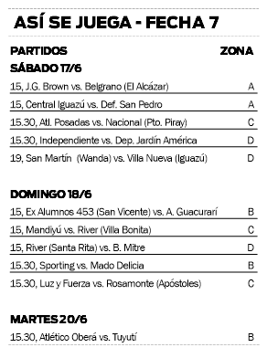 La actividad se inicia el sábado, en el barrio Villa Urquiza de Posadas, por la zona A, con el choque entre Jorge Gibson Brown y Belgrano de El Alcázar, desde las 15. El mismo día, el líder Central Iguazú enfrentará a uno de los escoltas, Defensores de San Pedro, desde las 16.