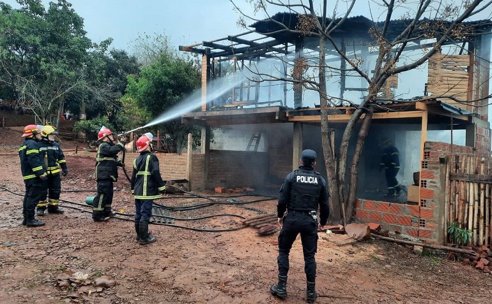 El intenso trabajo del personal de la División Bomberos de la Policía y Bomberos Voluntarios, la casa fue consumida por completo y la mujer y sus cuatro hijos quedaron en la calle y sin nada.