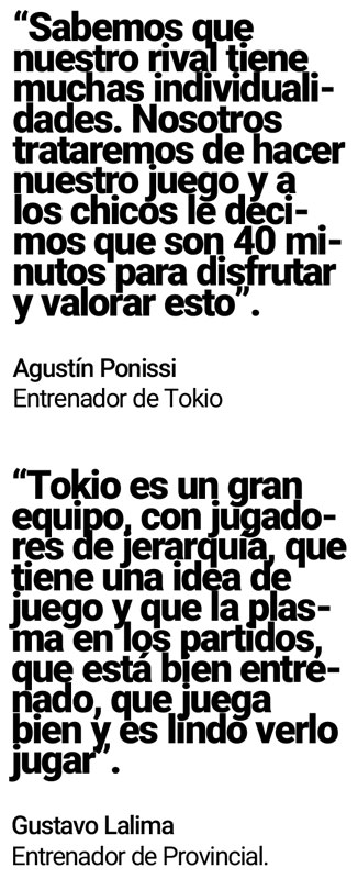 Si bien todavía debe sortear a su rival de hoy, Tokio ya conoce quién será su rival en una hipotética final. Será el ganador de la serie del mejor de la Conferencia Cuyo, que tendrá como protagonistas a Amancay de La Rioja y Talleres de Tafí Viejo de Tucumán.