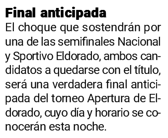 Las líderes e invictas Sportivo Eldorado se cruzarán con las vigentes campeonas Nacional de Puerto Piray, mientras que Unión Cultural y Deportiva Eldorado se las verá con Deportivo Nueve de Julio.