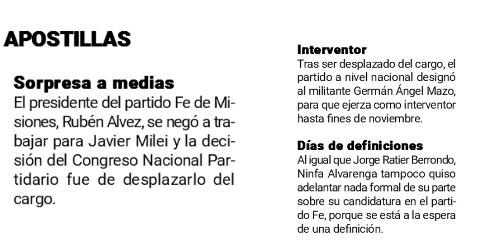 El desplazado presidente de Fe en Misiones, Rubén Alvez, admitió en FM 89.3 Santa María de las Misiones que la intervención llegó por negarse a trabajar para el libertario. Y confirmó que se presentó ante la Justicia para establecer si se sostiene la intervención. De ser así, Ninfa Alvarenga podría ser la candidata de Fe para Milei.