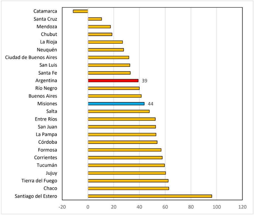 Por su parte, Misiones presenta una pobre performance al ubicarse apenas por encima de Formosa (posición 23° de un total de 24 jurisdicciones). El ingreso de un misionero es, en promedio, un 50% menor al del resto de las jurisdicciones.