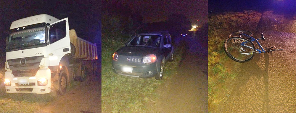 Según los datos aportados por fuentes policiales, ayer cerca de las 21.30, sobre la ruta provincial 6, a 500 metros del acceso a Corpus, por causas que se tratan de establecer se produjo un siniestro vial en el cual estuvieron involucrados un camión Mercedes Benz, conducido por un hombre de 46 años; un Fiat, conducito por un hombre de 73, y la bicicleta de Paredes.