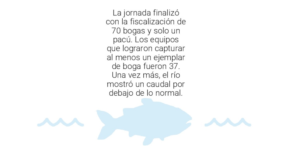 La jornada finalizó con la fiscalización de 70 bogas y solo un pacú, señalaron desde la organización. Y fueron 37 los equipos que lograron capturar al menos un ejemplar de boga en un río que nuevamente mostró un caudal por debajo de lo normal.