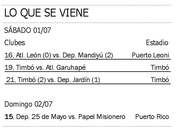 En tanto, en cancha de Timbó, el verde recibirá a su tradicional rival de pueblo, Deportivo Jardín América, al que, en la ida, le había ganado por 2 a 1 de visitante.