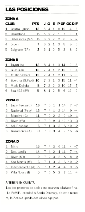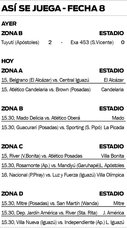 Finalmente, en la Zona D, Bartolomé Mitre enfrentará en el estadio Ernesto “Tito” Cucchiaroni a San Martín de Wanda. A su vez, Deportivo Jardín América recibirá a River de Santa Rita; y, en el estadio de la Liga de Iguazú, el local, Villa Nueva, se medirá con Independiente de Apóstoles.