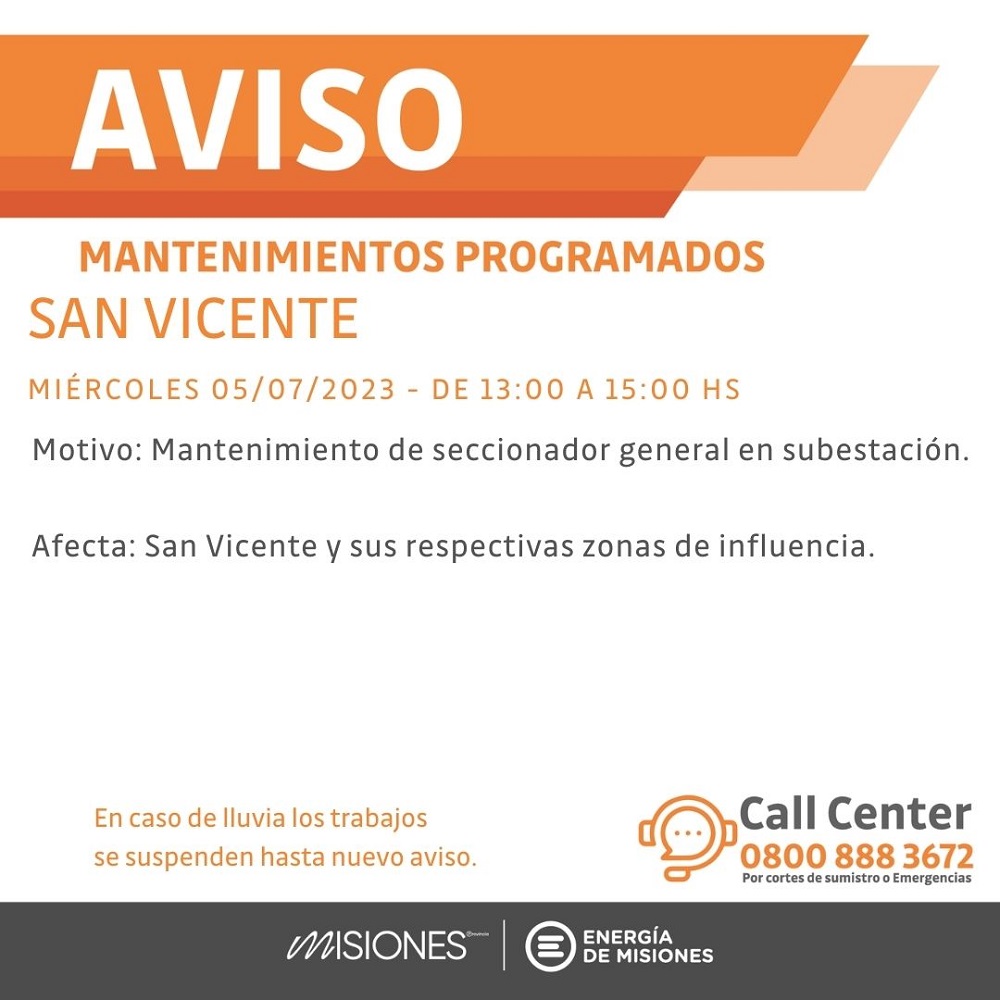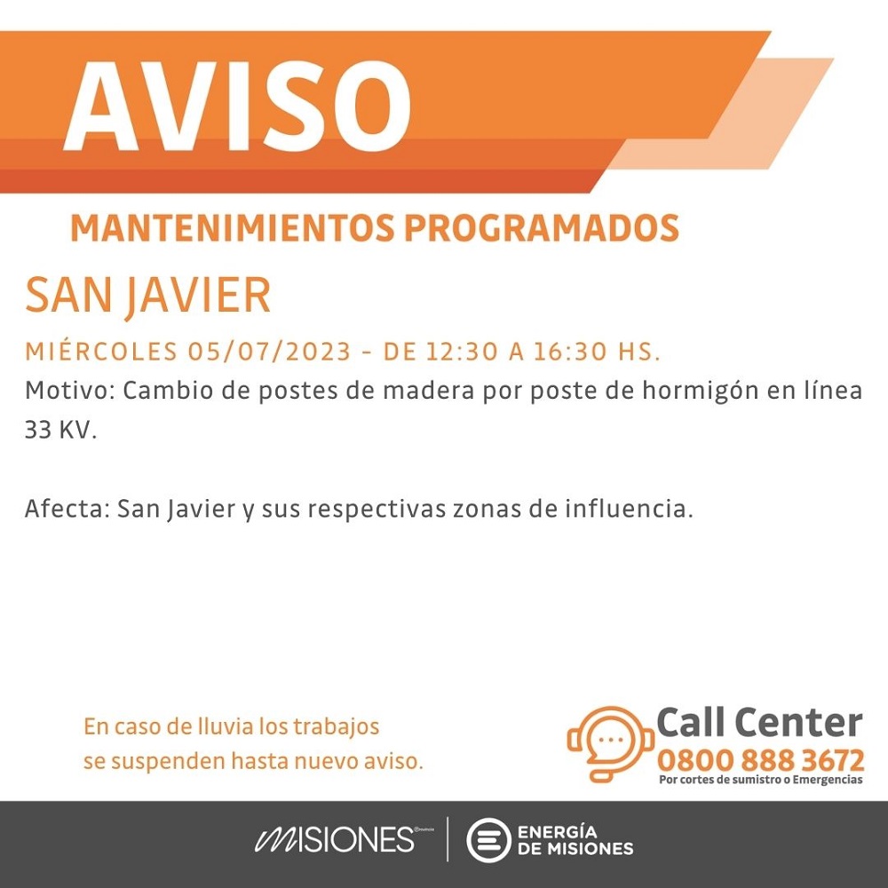 Energía de Misiones anunció interrupciones programadas del servicio por la realización de diversos trabajos.