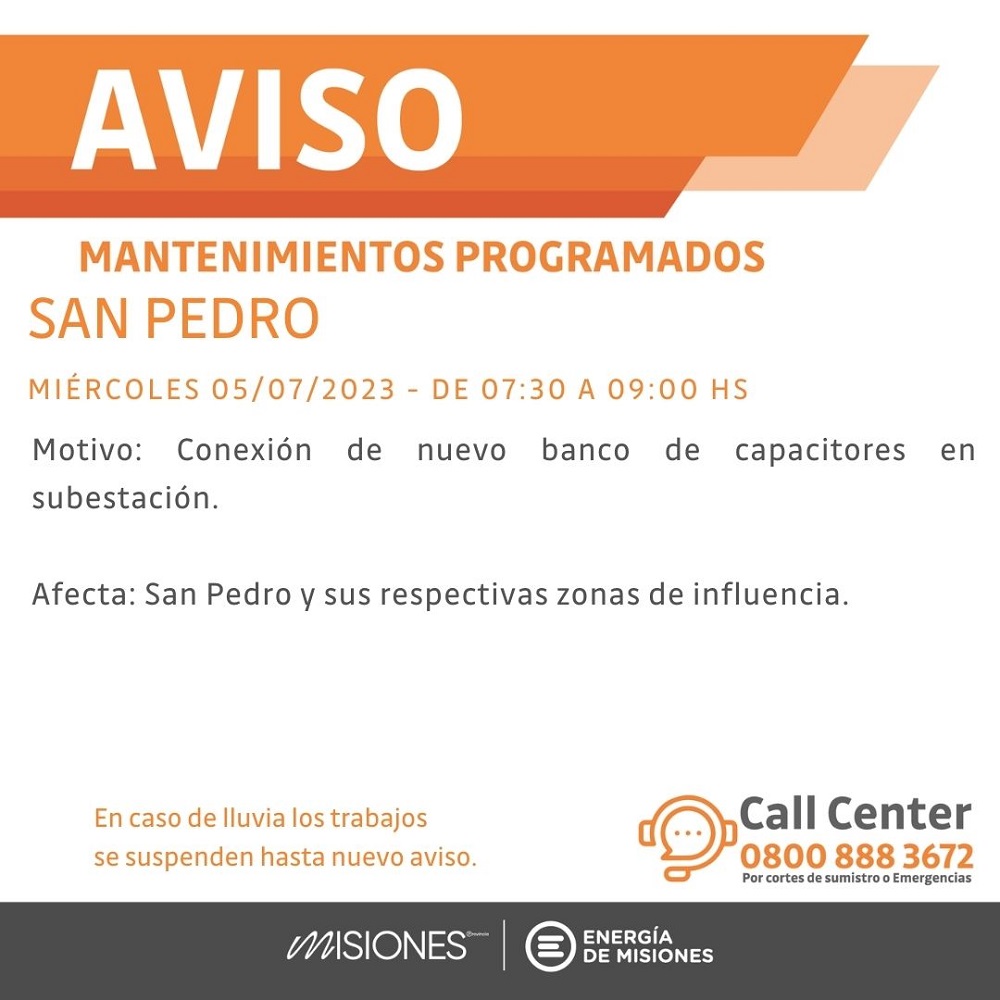 Además, toda el área de San Pedro estará sin suministro este miércoles de 7:30 a 9 para realizar la conexión de un nuevo banco de capacitores en la subestación local; y la de San Vicente sufrirá un “apagón” de 13 a 15, también este miércoles, por tareas de mantenimiento en las instalaciones de la subestación.