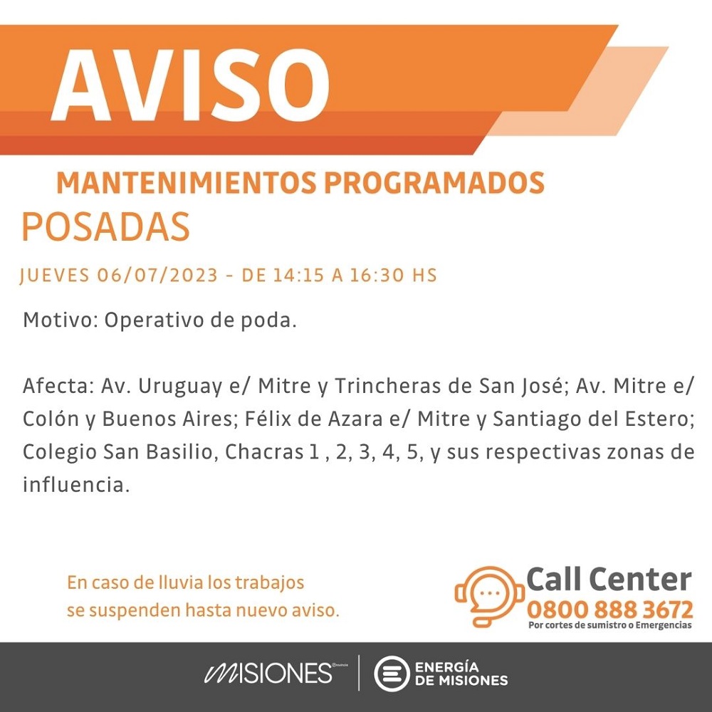 Entretanto, ese mismo día de 14:15 a 16:30 están previstos más operativos de poda que demandarán la desconexión de la red energética en el área de influencia de la avenida Uruguay entre Mitre y Trincheras de San José; Mitre entre Colón y Buenos Aires; Félix de Azara entre Mitre y Santiago del Estero; chacras 1, 2, 3, 4 y 5; y el Colegio San Basilio Magno.