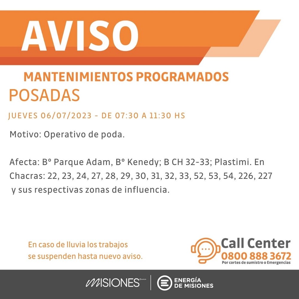 El jueves el corte de suministro abarcará los barrios Parque Adam, Kennedy, Cristo Rey (chacras 32-33), Plastimi y las chacras 22, 23, 24, 27, 28, 29, 30, 31, 52, 53, 54, 226, 227 y alrededores. Será entre las 7:30 y las 11:30, con motivo de operativos de poda en la traza del tendido eléctrico.