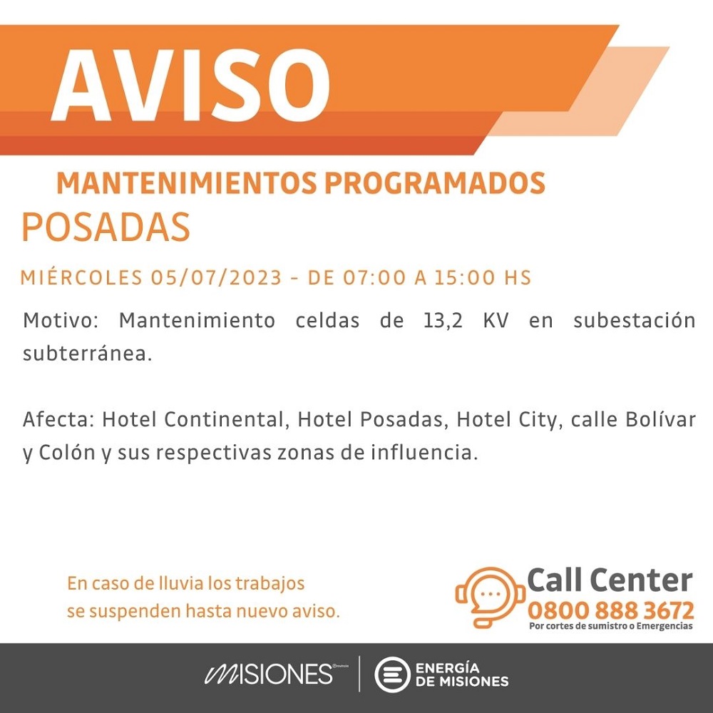 Numerosos barrios de Posadas quedarán sin suministro eléctrico entre el miércoles y el jueves, en distintas franjas horarias, con motivo de cortes del servicio programados por Energía de Misiones para la concreción de tareas de mantenimiento en el tendido.
