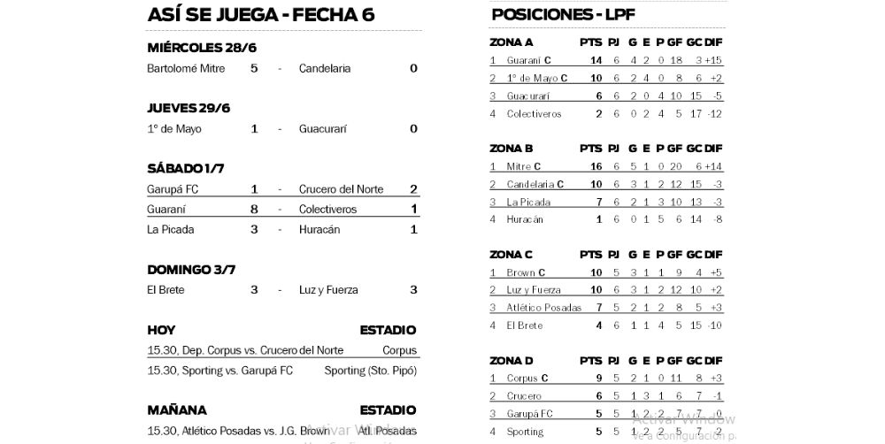 Vale resaltar que, durante el último finde, ya se consumaron las clasificaciones de Guaraní Antonio Franco y 1° de Mayo, por la Zona A; y de Bartolomé Mitre y Atlético Candelaria, por la Zona B; además de Brown y Corpus, que ahora deben definir en qué posición avanzarán de ronda.